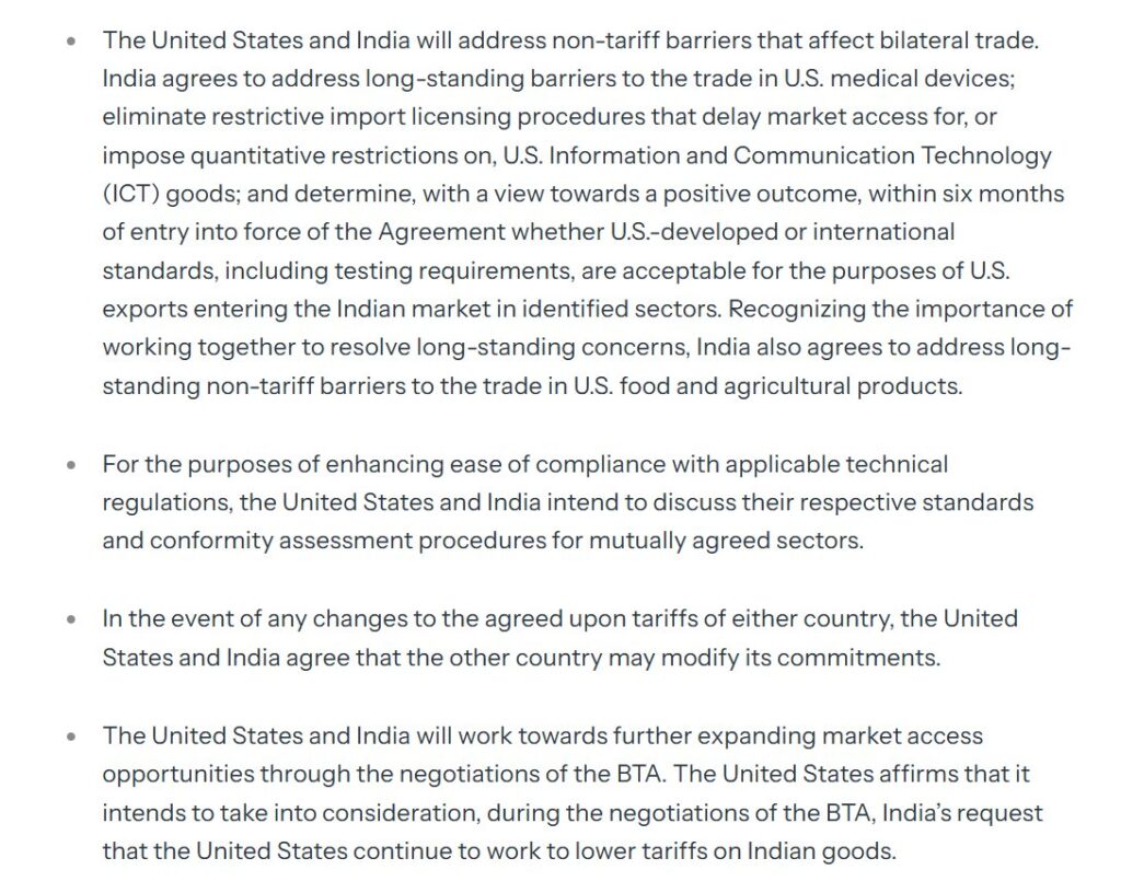 അടുത്തിടെ അമേരിക്കൻ പ്രസിഡൻ്റ് ഡൊണാൾഡ് ട്രംപ് പ്രഖ്യാപിച്ച ധാരണകളുടെ തുടർച്ചയായാണ് ഈ കരാർ. ഇന്ത്യൻ ഉൽപ്പന്നങ്ങൾക്ക് അമേരിക്ക ചുമത്തിയിരുന്ന 50 ശതമാനം നികുതി 18 ശതമാനമായി കുറയ്ക്കും. ഇതിന് പകരമായി റഷ്യയിൽ നിന്നുള്ള എണ്ണ ഇറക്കുമതി ഇന്ത്യ അവസാനിപ്പിക്കുകയും അമേരിക്കൻ ഉൽപ്പന്നങ്ങൾക്കുള്ള വ്യാപാര തടസ്സങ്ങൾ നീക്കം ചെയ്യുകയും ചെയ്യും. മാർച്ചോടെ ഔദ്യോഗിക കരാറിൽ ഒപ്പിടാനാണ് ലക്ഷ്യമിടുന്നതെന്ന് ഇന്ത്യൻ വാണിജ്യ മന്ത്രി പീയൂഷ് ഗോയൽ അറിയിച്ചു.