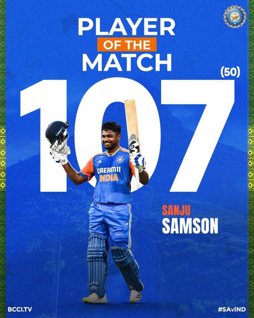 ഡർബൻ : ദക്ഷിണാഫ്രിക്കയ്ക്കെതിരെ ഡർബനിലെ കിംഗ്‌സമേഡ് സ്റ്റേഡിയത്തില്‍ നടന്ന ആദ്യ ട്വന്‍റി 20 മല്‍സരത്തില്‍ സഞ്ജു സാംസണ് സെഞ്ചുറി. ട്വന്‍റി 20യില്‍ തുടർച്ചയായി രണ്ട് മത്സരങ്ങളിൽ സെഞ്ചുറി നേടുന്ന ആദ്യ ഇന്ത്യന്‍ താരമായി സഞ്ജു ; ലോകത്തിലെ നാലാമത്തെ താരവും ! ബംഗ്ലാദേശിനെതിരായ ട്വൻ്റി20 പരമ്പരയിലാണ് ഇതിന് തൊട്ട് മുൻപ് സഞ്ജു സെഞ്ച്വറി നേടിയത്. 40 പന്തിലായിരുന്നു ആ കന്നി സെഞ്ച്വറി. ഡർബനിൽ 47 പന്തുകളിലാണ് സഞ്‍ജുവിൻ്റെ സെഞ്ചുറി. ആദ്യ 27 പന്തുകളില്‍ തന്നെ അര്‍ദ്ധ സെഞ്ചുറി കുറിച്ച സഞ്ജു 50 പന്തുകൾ നേരിട്ട് 7 ഫോറും 10 സിക്സും സഹിതം 107 റൺസാണെടുത്തത്. മാൻ ഓഫ് ദ മാച്ചും സഞ്ജു സാംസണാണ്.