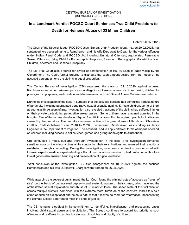 ബന്ദ : ആറ് വർഷം മുമ്പ് ഉത്തർപ്രദേശിലെ ചിത്രകൂടിൽ പ്രായപൂർത്തിയാകാത്ത കുട്ടികളുടെ അശ്ലീല വീഡിയോകൾ ഡാർക്ക് വെബിൽ ചിത്രീകരിച്ച് വിറ്റതിന് ദമ്പതികൾക്ക് വെള്ളിയാഴ്ച പ്രത്യേക കോടതി വധശിക്ഷ വിധിച്ചു. ബന്ദയിലെ ലൈംഗിക കുറ്റകൃത്യങ്ങളിൽ നിന്നുള്ള കുട്ടികളുടെ സംരക്ഷണം (പോക്സോ) കോടതിയാണ് വിപുലമായ വാദം കേൾക്കലിന് ശേഷം വിധി പുറപ്പെടുവിച്ചത്.