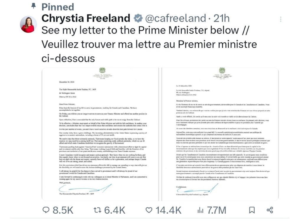 ട്രൂഡോയുടെ നിലപാടിനെക്കുറിച്ചോർത്തപ്പോൾ സത്യസന്ധവും പ്രായോഗികവുമായ ഏകമാർഗ്ഗം രാജിവെക്കുക എന്നതാണെന്ന് ക്രിസ്റ്റിയ എക്സിൽ കുറിച്ചു. കുടിയേറ്റം, സാമ്പത്തിക പ്രതിസന്ധി, യു.എസുമായും ഇന്ത്യയുമായുള്ള നയതന്ത്ര, വ്യാപാര തർക്കങ്ങൾ എന്നിങ്ങനെ വിവിധ വിഷയങ്ങളിൽ ട്രൂഡോയുടെ സർക്കാരിനെതിരെ കടുത്ത ഭരണവിരുദ്ധ വികാരമാണ് രാജ്യത്തുള്ളത്. ഇതിനിടയിലാണ് ഉപപ്രധാനമന്ത്രിയുടെ രാജി എന്നതും ശ്രദ്ധേയം.