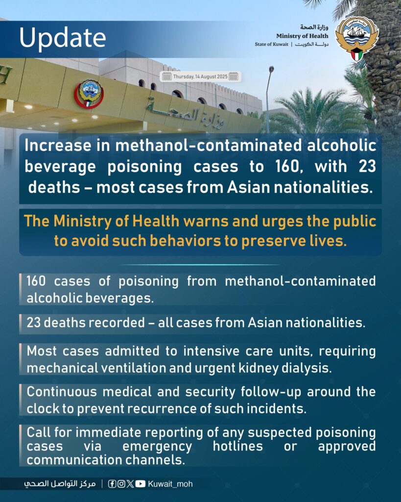 വിഷമദ്യ ദുരന്തത്തിൽ 23 പേർ മരണമാണ് ഇപ്പോൾ സ്ഥിരീകരിച്ചിട്ടുള്ളത്. ജീവൻ നഷ്ടമായവരെല്ലാം ഏഷ്യക്കാർ ആണെന്ന് കുവൈറ്റ് ആരോഗ്യ മന്ത്രാലയത്തെ ഉദ്ധരിച്ച് റോയിട്ടേഴ്സ് റിപ്പോർട്ട് ചെയ്തു. ദുരന്തത്തിൽ കണ്ണൂർ ഇരിണാവ് സ്വദേശി പി സച്ചിനും (31) ജീവൻ നഷ്ടമായി. വിഷബാധയേറ്റവരുടെ എണ്ണം 160 ആയി ഉയർന്നു.. ഇവരിൽ 21 പേർക്ക് കാഴ്ച നഷ്ടപ്പെടുകയോ കാഴ്ച കുറയുകയോ ചെയ്തെന്നും റിപ്പോർട്ടിലുണ്ട്. മെത്തനോൾ കലർന്ന അനധികൃത മദ്യം കഴിച്ചതാണ് നിരവധി പേര്ക്ക് വിഷബാധയേൽക്കാൻ കാരണമായതെന്നാണ് പ്രാഥമിക വിവരം.