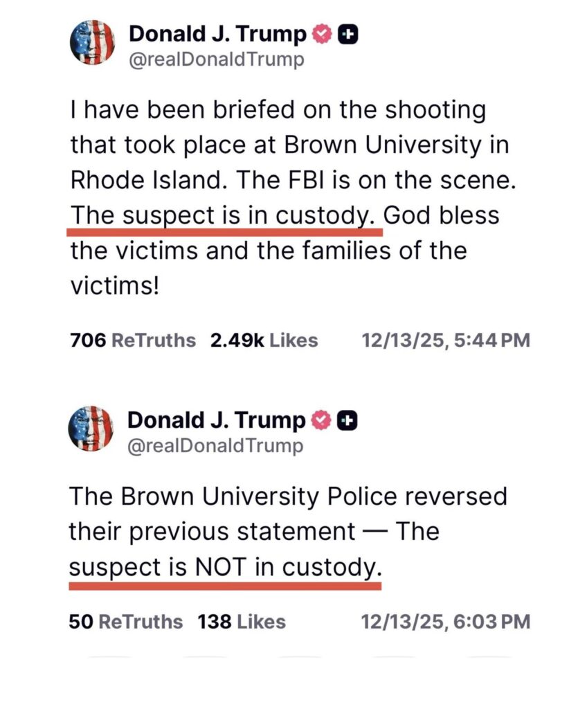 ബ്രൗൺ യൂണിവേഴ്സിറ്റി ഭരണകൂടം ആദ്യം വിദ്യാർത്ഥികളോടും ജീവനക്കാരോടും സംശയിക്കപ്പെടുന്ന ഒരാൾ കസ്റ്റഡിയിലുണ്ടെന്ന് പറഞ്ഞിരുന്നെങ്കിലും പിന്നീട് അത് തിരുത്തി. കസ്റ്റഡിയിലെടുത്ത വ്യക്തിക്ക് സംഭവവുമായി ബന്ധമില്ലെന്ന് മേയർ വ്യക്തമാക്കി. ഇരകൾക്കും അവരുടെ കുടുംബങ്ങൾക്കും പ്രസിഡന്റ് ഡൊണാൾഡ് ട്രംപ് സോഷ്യൽ മീഡിയയിലൂടെ അനുശോചനം രേഖപ്പെടുത്തി. പോലീസ് സംഭവസ്ഥലത്ത് നിന്ന് വിവരങ്ങൾ ശേഖരിക്കുന്നുണ്ടെന്നും എഫ്ബിഐ ഓപ്പറേഷനിൽ സഹായിക്കുന്നുണ്ടെന്നും അദ്ദേഹം പറഞ്ഞു