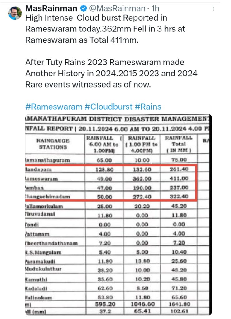 കാലാവസ്ഥാ ബ്ലോഗർ ആർ പ്രദീപ് ജോൺ മഴയെ അസാധാരണമെന്ന് വിശേഷിപ്പിച്ചു – “രാമേശ്വരത്ത് 10 മണിക്കൂറിനുള്ളിൽ 411 മില്ലിമീറ്റർ മഴ. ചരിത്രപരമായ പ്രത്യേക മഴ. മൂന്ന് മണിക്കൂറിനുള്ളിൽ രാമേശ്വരത്ത് 362 മില്ലിമീറ്റർ രേഖപ്പെടുത്തി.” സാധാരണ മേഘവിസ്ഫോടനം എന്നതിലുപരി ‘സൂപ്പർ ക്ലൗഡ് ബർസ്റ്റ്’ എന്നാണ് അദ്ദേഹം ഈ അതിശക്ത മഴയെ വിശേഷിപ്പിച്ചത്.