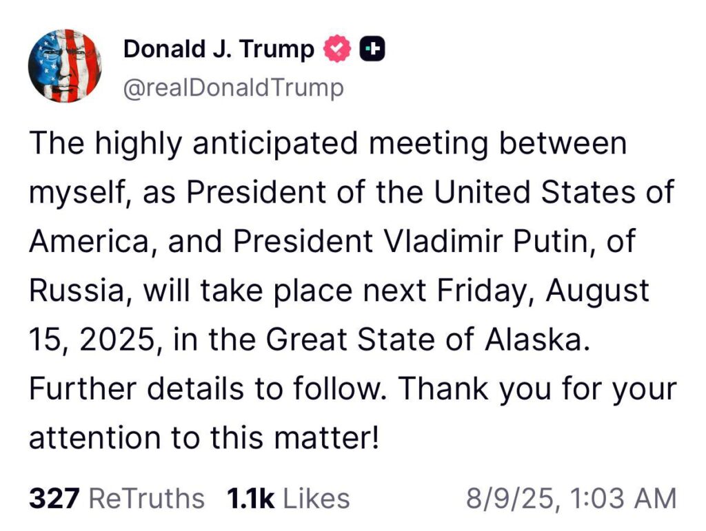 “അമേരിക്കൻ ഐക്യനാടുകളുടെ പ്രസിഡന്റ് എന്ന നിലയിൽ ഞാനും റഷ്യൻ പ്രസിഡന്റ് വ്ളാഡിമിർ പുടിനും തമ്മിലുള്ള ഏറെ പ്രതീക്ഷയോടെ കാത്തിരിക്കുന്ന കൂടിക്കാഴ്ച അടുത്ത വെള്ളിയാഴ്ച, 2025 ഓഗസ്റ്റ് 15 ന് ഗ്രേറ്റ് സ്റ്റേറ്റായ അലാസ്കയിൽ നടക്കും.” ട്രംപ് ട്രൂത്ത് സോഷ്യലിലെ ഒരു പോസ്റ്റിൽ പറഞ്ഞു.