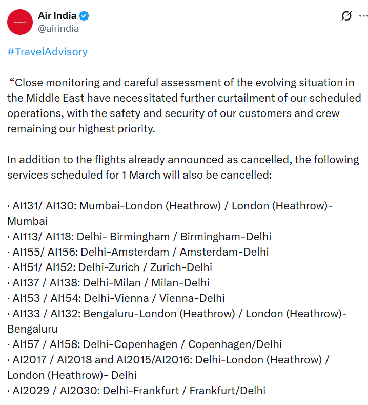 ഇറാനിലെ സ്ഥലങ്ങൾ ലക്ഷ്യമിട്ട് അമേരിക്കയും ഇസ്രായേലും സംയുക്തമായി നടത്തിയ മിസൈൽ ആക്രമണങ്ങൾ പശ്ചിമേഷ്യയിലുടനീളം വ്യാപകമായ വ്യോമാതിർത്തി അടച്ചുപൂട്ടലിന് കാരണമാവുകയും ആഗോള വ്യോമയാന റൂട്ടുകളെ ബാധിക്കുകയും ചെയ്തതിനെത്തുടർന്ന് പ്രാദേശിക സംഘർഷങ്ങൾ വർദ്ധിച്ച സാഹചര്യത്തിലാണ് തടസ്സങ്ങൾ ഉണ്ടായത്. സുരക്ഷാ സാഹചര്യങ്ങൾക്കനുസരിച്ച് ഷെഡ്യൂളുകൾ ദ്രുതഗതിയിലുള്ള മാറ്റത്തിന് വിധേയമാകുന്നതിനാൽ വിമാന അപ്ഡേറ്റുകൾ പതിവായി നിരീക്ഷിക്കാൻ എയർലൈൻസ് യാത്രക്കാരോട് നിർദ്ദേശിച്ചു.